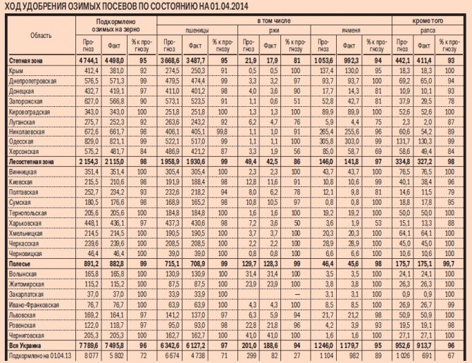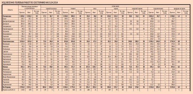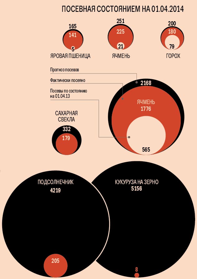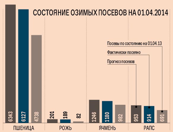 В 2014 г. аграрии соберут не более 55,7 млн т зерновых, что на 6,5 % меньше, чем в прошлом году, прогнозирует директор информационной компании «ПроАгро» Николай Верницкий. По его прогнозам, фермеры соберут 20,3 млн т пшеницы (на 8,5 % меньше), 25,5 млн т зерновых (на 8,2 % меньше), 15,2 млн т масличных (на 5,9 % меньше). При этом ожидается увеличение на 6,1 % валового сбора ячменя — до 7,98 млн т.