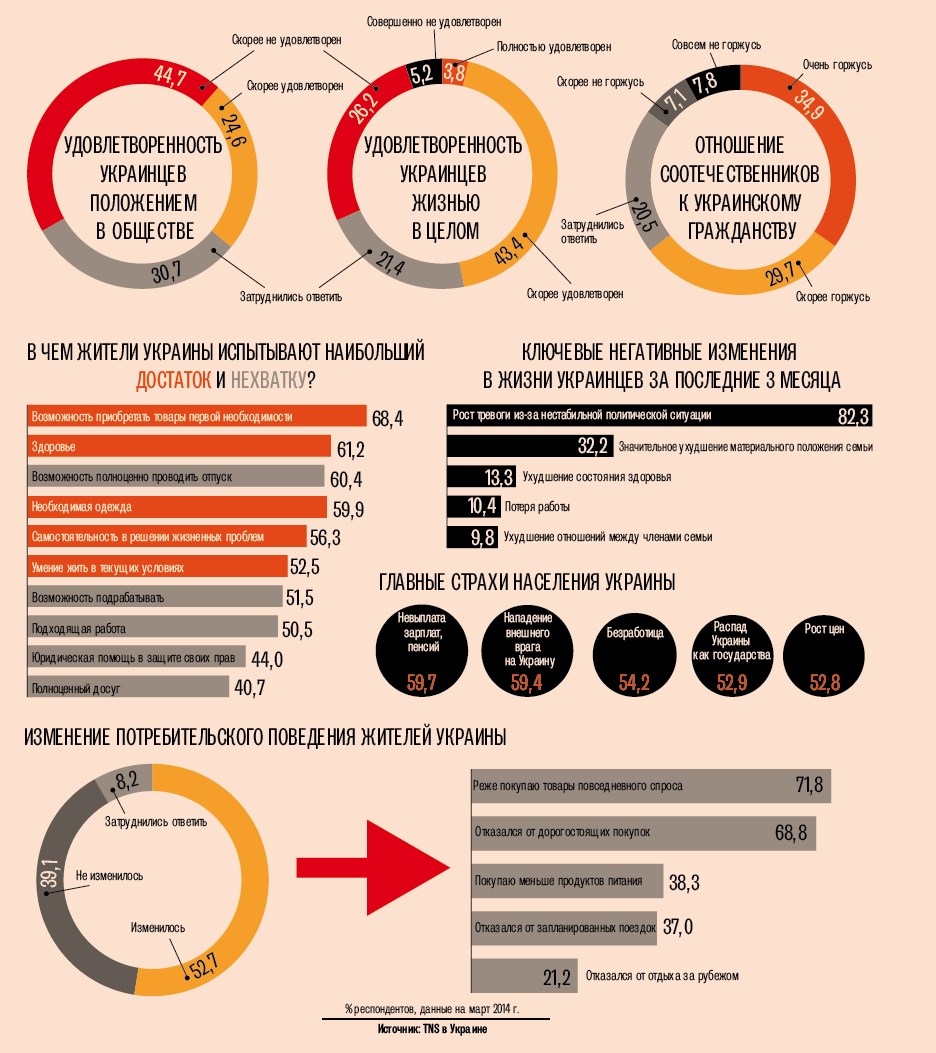 Согласно данным отчета, за последние три месяца украинские граждане ощутили целый ряд негативных изменений в своей жизни, ключевыми среди которых оказались рост тревоги в связи с нестабильной политической ситуацией (82,3 % респондентов), значительное ухудшение материального положения семьи (32,2 %) и ухудшение состояния здоровья (13,3 %). Каждый десятый из опрошенных утверждает, что за последнее время потерял работу или поссорился с родными (10,4 % и 9,8 % соответственно). И только 8,4 % украинцев не отметили никакого ухудшения.
