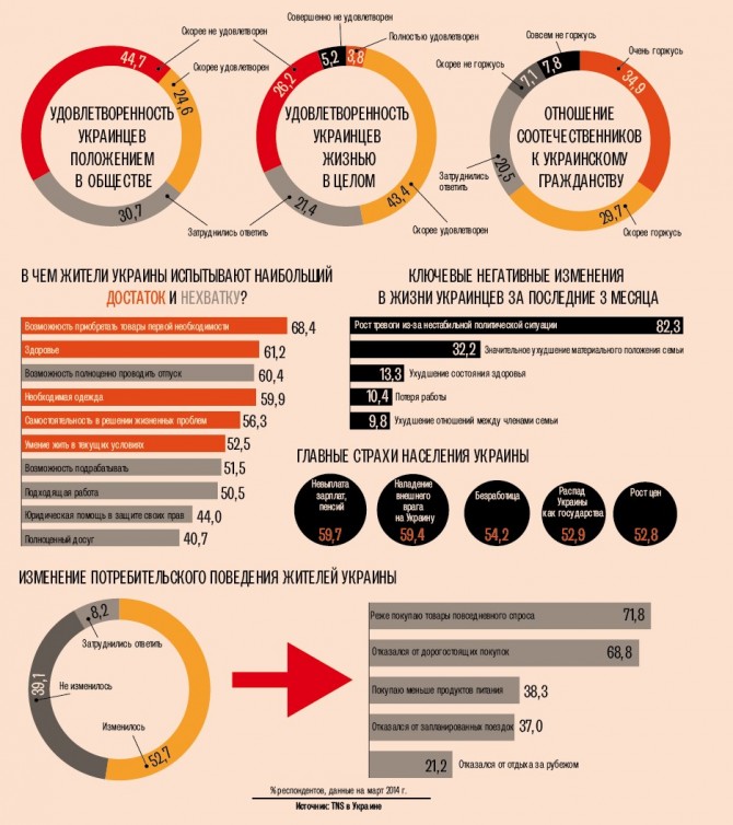 Около половины (44,7 %) жителей Украины не удовлетворены своим социальным статусом, тогда как вполне доволен своим положением в обществе лишь каждый четвертый (24,6 %) из наших сограждан. Таковы результаты первой волны регулярного исследования «TNS On-line Tracking», реализованного в Украине компанией TNS. Информацией для анализа послужил проведенный в марте 2014 г. опрос более 1 тыс. украинских интернет-пользователей в возрасте 18‑55 лет.