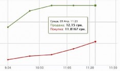 Вчера официальный курс гривни достиг 11,88 грн за доллар. С начала года национальная денежная единица потеряла в цене 48 %. Несмотря на то что фактический объемом сделок на межбанковском валютном рынке последнюю неделю был незначительным, давление на гривню оказывают возрастающий риск военного конфликта и протесты на востоке страны. Вчера торги по доллару на межбанке закрылись в диапазоне 12,15‑12,45 UAH / USD.
