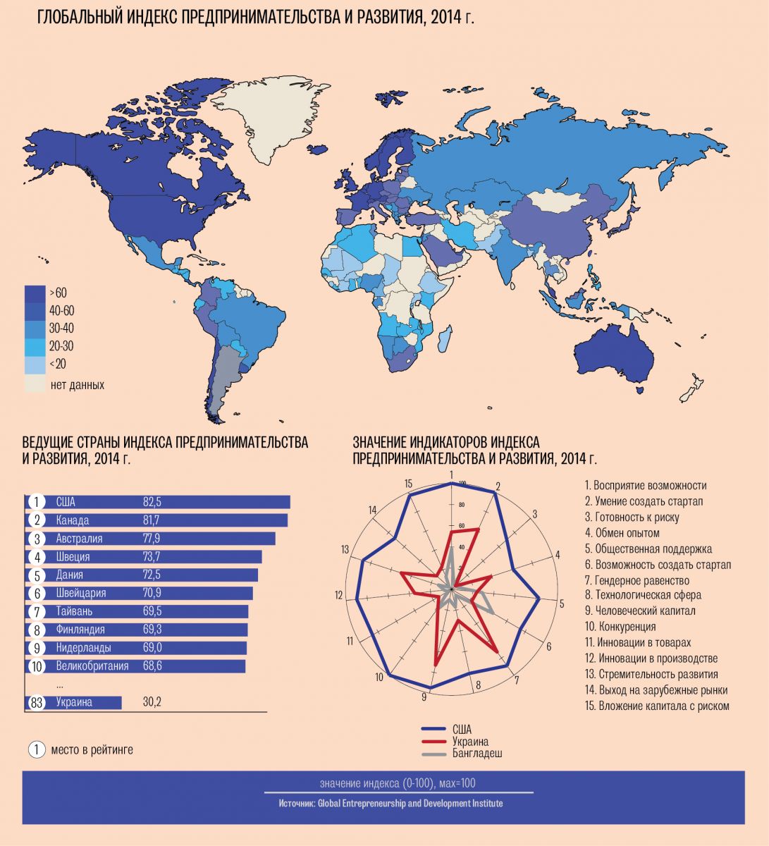 По уровню способствования предпринимательской деятельности Украина расположилась на 83‑й позиции глобального списка, охватывающего 121 страну мира. Об этом свидетельствуют результаты четвертого ежегодного отчета «Глобальный индекс предпринимательства и развития — 2014» (2014 Global Entrepreneurship and Development Index), обнародованного американской исследовательской организацией Global Entrepreneurship and Development Institute.