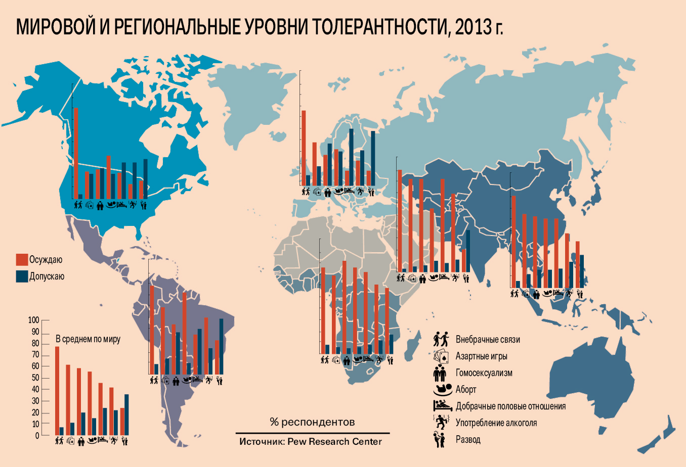 Цель исследователей — оценить отношение населения планеты к таким неоднозначным явлениям, как внебрачные связи, азартные игры, гомосексуализм, аборты, добрачные половые отношения, употребление алкоголя и развод.