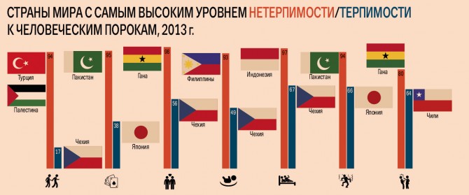 Противниками однополых отношений являются шестеро из десяти (59 %) респондентов, тогда как каждый пятый опрошенный допускает наличие гомосексуалистов в обществе. Абсолютно аморальной и неприемлемой однополую связь считают почти все (98 %) граждане Ганы, тогда как 56 % опрошенных чехов считают гомосексуализм составляющей частью современного общества.