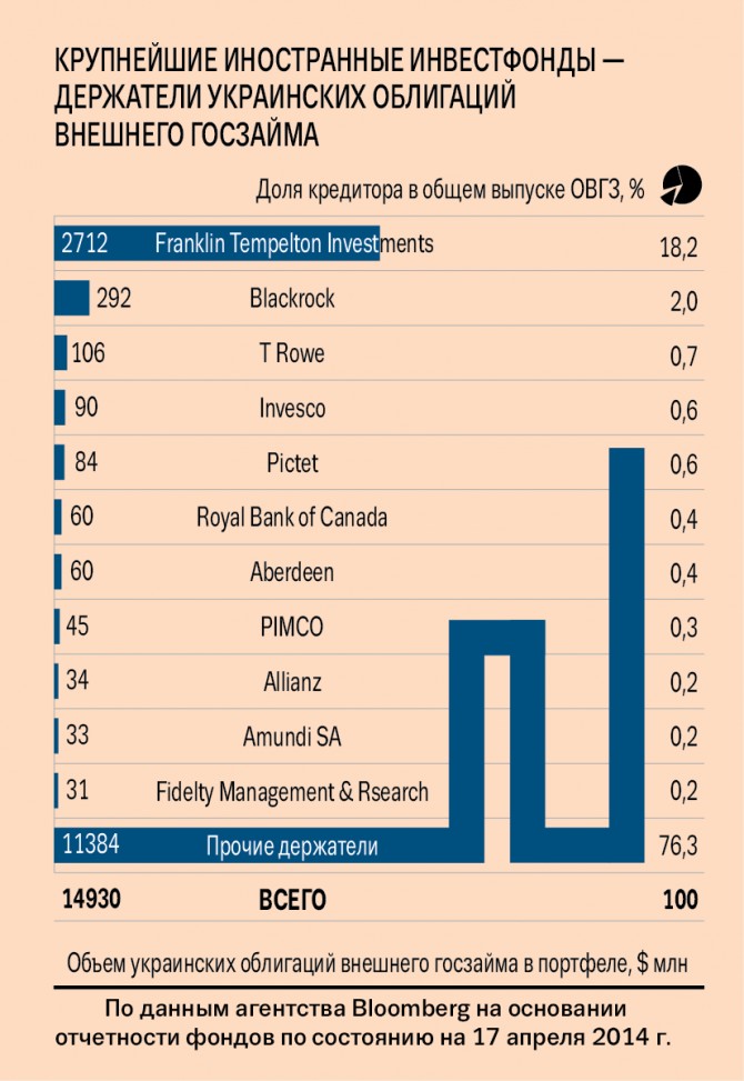 Крупнейший держатель украинских бондов — американский инвестиционный фонд Franklin Templeton в І квартале 2014 г. увеличил долю облигаций Украины в своем портфеле почти до 5 %, говорится в официальном сообщении фонда. Ранее в его портфеле таких бумаг было лишь 2 %. При этом с учетом вложений европейских партнеров фонда Franklin Templeton общая сумма вложений фонда в украинские долговые обязательства в феврале составила $ 6,4 млрд (около 70 млрд грн).