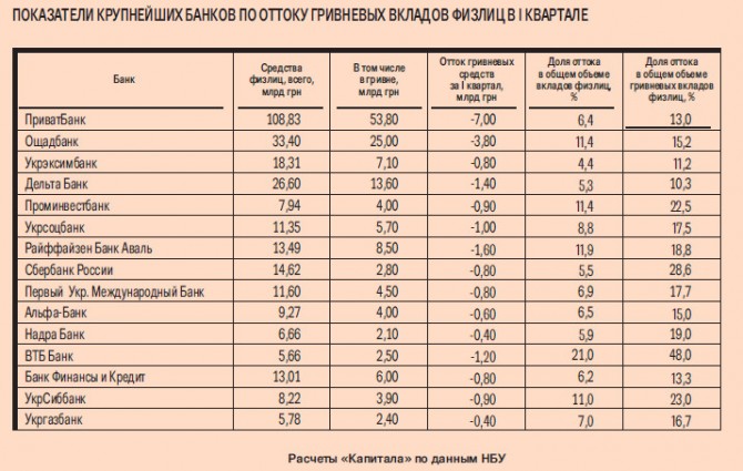В І квартале 2014 г. все 15 банков из группы крупнейших по активам ощутили отток гривневых средств физлиц. При этом наибольшие цифры показали: ПриватБанк — 7,9 млрд грн, Ощадбанк — около 3,8 млрд грн и Райффайзен Банк Аваль — 1,6 млрд грн.