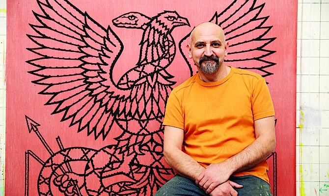 — Для меня очень важным проектом является «Неофолк». Это, можно сказать, абстракции — идущие не от головы, а от сердца. Рефлексии то ли на гуцульские, то ли на бессарабские народные ковры, знакомые мне с детства. Тут нет цитат: это воспоминания в чистом виде. Собственно, как и в «геральдике»: я рисую не предметы, а свое представление о них — лопатах, ведрах, вениках, музыкальных инструментах. В связи с этим иногда даже случаются казусы: когда первый раз рисовал электробалалайку, изобразил ее с четырьмя струнами.