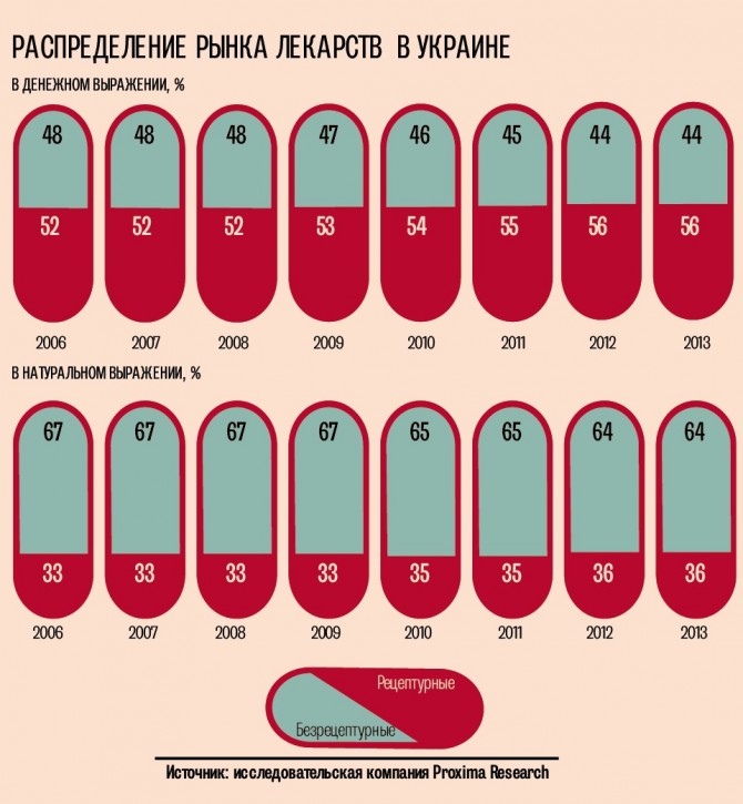 По данным исследовательской компании Proxima Research, в прошлом году было продано 1434 млн упаковок на 35,8 млрд грн. Доля рецептурных лекарств занимает 56 % фармацевтического рынка в денежном выражении и 36 % — в натуральном.