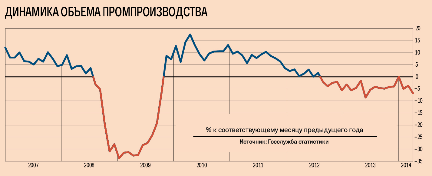 Положительную динамику в минувшем месяце продемонстрировали только несколько отраслей промышленности. В частности, производство электрического оборудования (+18 %), производство мебели, ремонт и монтаж машин и оборудования (+3,8 %), пищевая промышленность (+0,2 %). Смогли показать рост добыча металлической руды (+0,5 %) и поставка электроэнергии (+1,1 %). В остальных отраслях продолжился обвал. Наибольшее падение зафиксировано в производстве автотранспортных средств (–33,1 %), компьютеров, электрической и оптической продукции (–29 %), химии (–23,3 %), а также в машиностроении (–18,9 %), металлургии (–12,8 %). «Официальные данные указывают на дальнейшее снижение экономической активности в апреле на фоне продолжающего кризиса в восточных регионах. Но резкого ухудшения не наблюдалось, за исключением химической промышленности, производство которой снизилось на 23 % год к году в апреле по сравнению с –2,8 % в марте из‑за остановки нескольких химзаводов», — утверждает главный экономист Dragon Capital Елена Белан. По словам руководителя аналитического департамента ИК Eavex Capital Дмитрия Чурина, в апрельской статистике осталась неучтенной остановка Северодонецкого «Азота», из‑за чего данные по маю будут еще более пессимистичными.