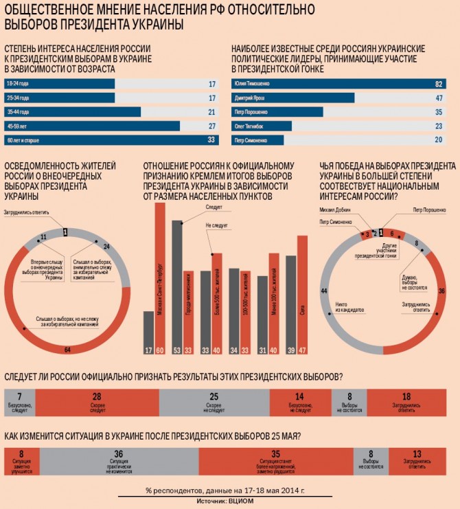 Согласно данным отчета, абсолютное большинство (88%) жителей России знали, что 25 мая 2014 г. в Украине выберут нового главу государства. При этом каждый четвертый (24%) респондент не просто слышал об этом событии, но и внимательно следил за перипетиями избирательной кампании. Интересно, что степень заинтересованности россиян украинской президентской гонкой была непосредственно связана с их возрастом: чем старше опрошенные, тем более внимательно они следили за политическими баталиями в Украине. Среди представителей старшего поколения (60 лет и старше) доля активно следивших за борьбой украинских политических лидеров оказалась практически вдвое большей, нежели среди российской молодежи (18-34 года) (33% против 17%).