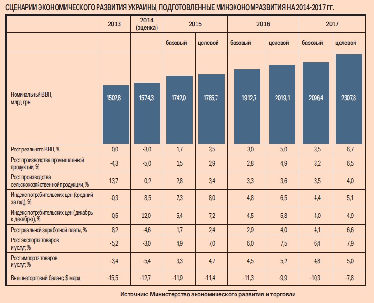 Министерство экономического развития и торговли подготовило сценарии экономического и социального развития Украины в 2015‑2017 гг. Согласно докладу первого заместителя министра Анатолия Максюты на заседании коллегии Минэкономразвития 22 мая (текст есть в распоряжении «Капитала»), министерство рассчитывает, что в следующем году украинская экономика возобновит рост. После нулевого роста в 2013 г. и ожидаемого спада на 3 % в текущем году, в 2015‑м экономика выйдет как минимум на 1,7 % роста, а в случае реализации оптимистического сценария — на 3,5 %.