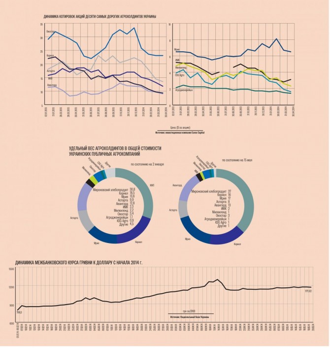 Девальвация гривни усугубляет финансовое состояние украинских агрокомпаний. Отчитавшиеся за I квартал структуры систематически дописывают в отчетах строку «foreign currency exchange loss», где отображают потери от курсовых колебаний. Самый дорогой агрохолдинг страны «Мироновский хлебопродукт» (МХП) получил максимальный убыток от курсовой разницы — $ 366 млн при выручке $ 309 млн. У «Индустриальной молочной компании» (ИМК) и «Милкиленда» этот показатель ниже — $ 31,7 млн (выручка — $ 10,66 млн) и € 46,79 млн (€ 77,29 млн) соответственно. Сахарный гигант «Астарта» потерял на курсовой разнице € 69,98 млн (€ 89,44 млн).