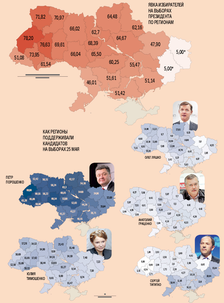 Петр Порошенко победил во всех регионах и только в девяти областях не смог набрать более 50 %. В основном это юго-восток страны. Если смотреть по избирательным округам, то Порошенко уступил первое место только в округе № 178 (Харьковская обл.). Здесь, на границе с Россией, взял первенство кандидат от Партии регионов Михаил Добкин.