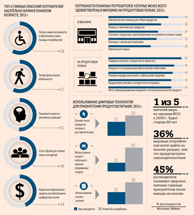 Почти половина (45 %) потребителей мира называют здоровое питание главным приоритетом после выхода на пенсию. Более важными аспектами жизни на пенсии мировое население считает сохранение физической и умственной активности, а также проведение времени в кругу семьи (78 % и 58 % соответственно). Таковы данные отчета «The Age Gap», подготовленного транснациональной компанией Nielsen. Информацией для анализа послужил проведенный в августе-сентябре 2013 г. онлайн-опрос, в котором приняли участие 30 тыс. человек из 60 стран мира.