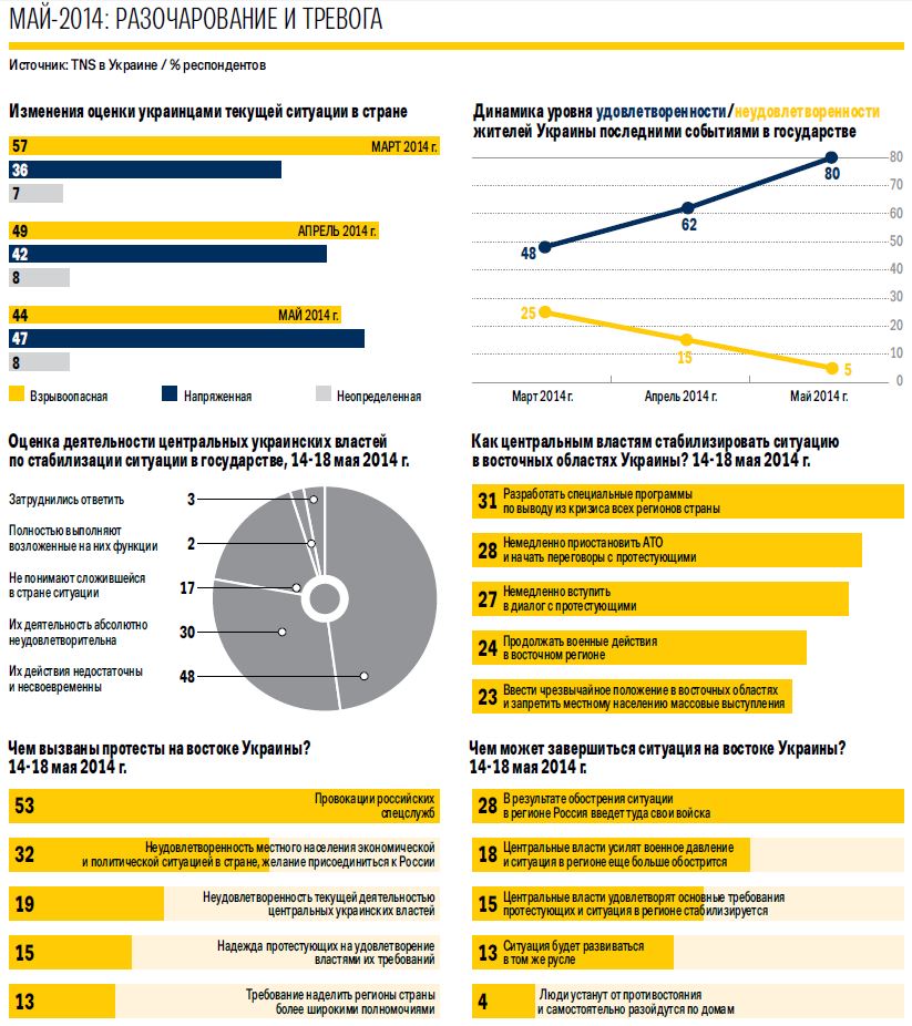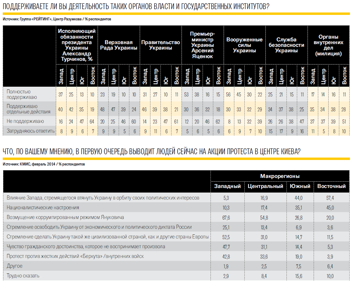 В целом данные социологии фиксируют серьезную проблему — неприятие центральной власти значительным количеством граждан. 46 % жителей юго-востока считают события на Майдане в Киеве прошедшей зимой государственным вооруженным переворотом, организованным оппозицией с помощью Запада. В Донецкой области такое мнение разделяют 70,5 % жителей, в Луганской — 61,3 %.