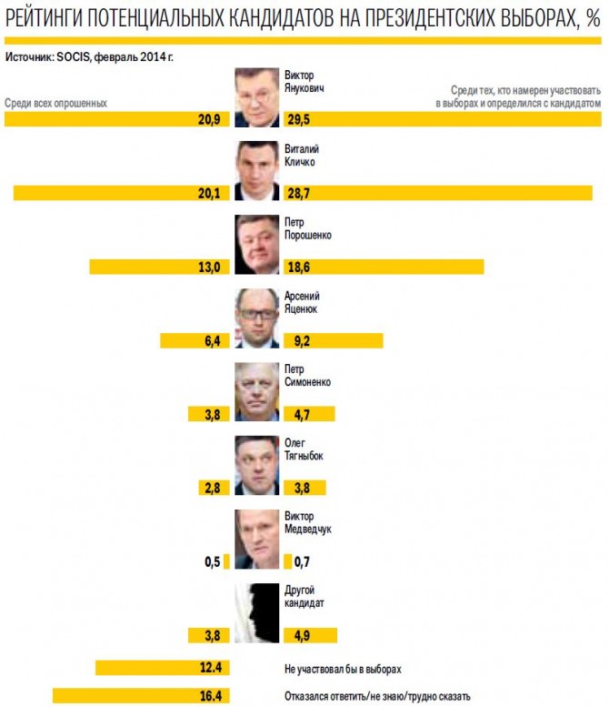 Удивительно, но на рейтинги политиков мало повлияли и отказ от подписания Януковичем ассоциации с Евросоюзом, и многотысячные митинги на Майдане, и столкновения на Грушевского: вплоть до кризисного февраля экс-президент все еще мог рассчитывать на победу. До самого конца Майдана Янукович оставался самым рейтинговым политиком страны, и даже за несколько дней до силового свержения около 30 % избирателей готовы были голосовать за него. Более того, как бы ни хотелось этого столичным оппозиционерам, пользовалась поддержкой большинства избирателей и Партия регионов: по данным тех же опросов, она однозначно выигрывала бы парламентские выборы, если бы они состоялись в то же время.