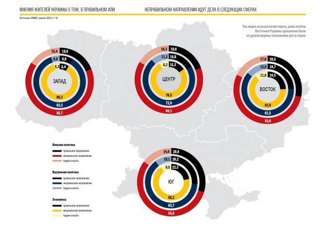 Аналогичные результаты зафиксировал и проведенный тогда же опрос КМИС. Большинство граждан по состоянию на апрель 2013 г. не были удовлетворены положением дел в Украине. 70 % полагали, что дела во внутренней политике идут в неправильном направлении (в т. ч. 32 % были однозначно в этом уверены), 73 % негативно оценивали тенденции в экономике (в т. ч. 43 % — однозначно негативно), а 60 % — во внешней политике (не сомневались в этом 26 %).