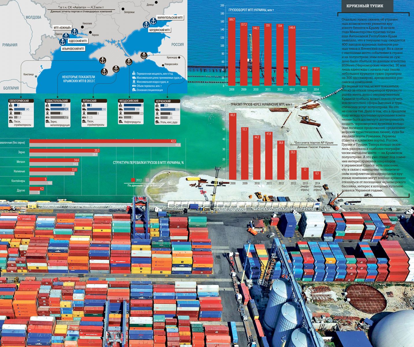 В 2013 г. доля крымских портов в морском грузообороте Украины составляла 6,5 %. Внешне цифра выглядит сравнительно маленькой, особенно с учетом того, что последние годы отечественная портовая отрасль работает с определенным недогрузом. Но важна номенклатура. Например, в крымских МТП было сосредоточено около 10 % всех отечественных зерноперевалочных комплексов (около 4 млн т в год). По предварительным данным, экспорт зерна и масличных в 2013/14 маркетинговом году (МГ) составит около 36 млн т, и в следующем МГ эксперты и зернотрейдеры снижения экспорта не ожидают. Таким образом, перед Украиной стоит задача замещения утраченных страной мощностей и строительства новых зерновых терминалов.