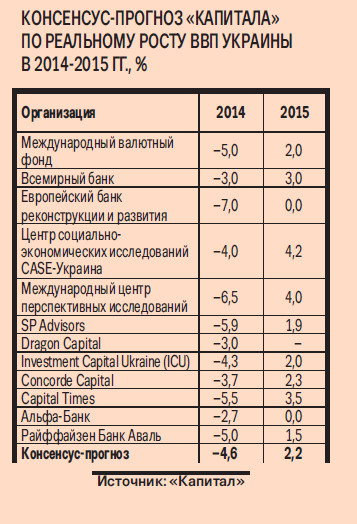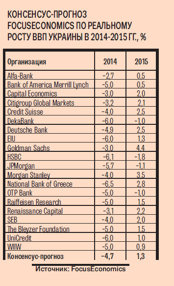 Украинскую экономику ждет еще более глубокое проседание, хотя когда именно — здесь эксперты не могут сойтись во мнении. Часть экспертов полагает, что достижение дна происходит как раз сейчас, во втором квартале. С апреля экономика утратила свой основной двигатель — частное потребление. Подрывает его девальвация гривни, сделавшая покупку импортной продукции крайнее непривлекательной для украинцев. По оценкам главы аналитического отдела Альфа-Банк Украина Алексея Блинова, реальные располагаемые доходы населения снизятся из‑за этого на 5 %, а в долларовом эквиваленте — намного сильнее. Также потребление страдает от инфляции, спровоцированной повышением тарифов на жилищно-коммунальные услуги. По оценкам руководителя аналитического департамента SP Advisors Виталия Ваврищука, если ранее оплата ЖКХ занимала порядка 10 % в потребительской корзине рядового украинца, то теперь ее доля выросла до 15‑17 %, уменьшив сумму, которую население может тратить на другие виды товаров и услуг. В результате по итогам второго квартала, подсчитал Боярчук, потребление домохозяйств упадет на 6,5 %, а по итогам года — на 6 % (в 2013 г. оно выросло на 5,6 %). В минусе по‑прежнему будет и инвестирование. «Неопределенность в стране и падение экономики лишают бизнес смысла вкладывать средства в расширение и модернизацию мощностей, которые компаниям в ближайшее время не понадобятся. А госинвестиции были урезаны для сокращения дефицита бюджета», — отмечает Блинов, ожидающий спада капитальных инвестиций более чем на 10 % по итогам года.
