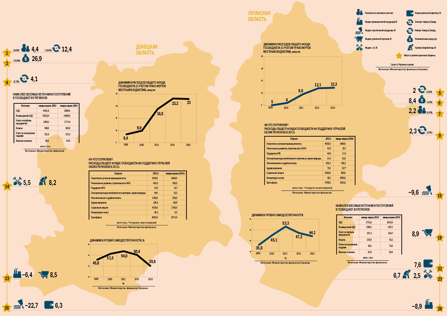 Кроме того, военный конфликт усугубил и так непростую экономическую ситуацию в регионе. Согласно официальным данным Министерства финансов, Луганская и Донецкая области являются дотационными. Только в прошлом году Донецкая область собрала 20,5 млрд грн доходов при расходах в 46 млрд грн. В Луганской области аналогичная ситуация — ее доходы за 2013 г. составили 11,1 млрд грн, расходы — 23,2 млрд грн. Таким образом, уровень самодостаточности этих регионов составил менее 50 %: Донецкой области — 44,6 %, Луганской — 47,8 %. При этом, судя по динамике общего фонда областных бюджетов, показатель самодостаточности Луганска в 2013 г. оказался самым низким за последние четыре, а Донецка — за последние пять лет.