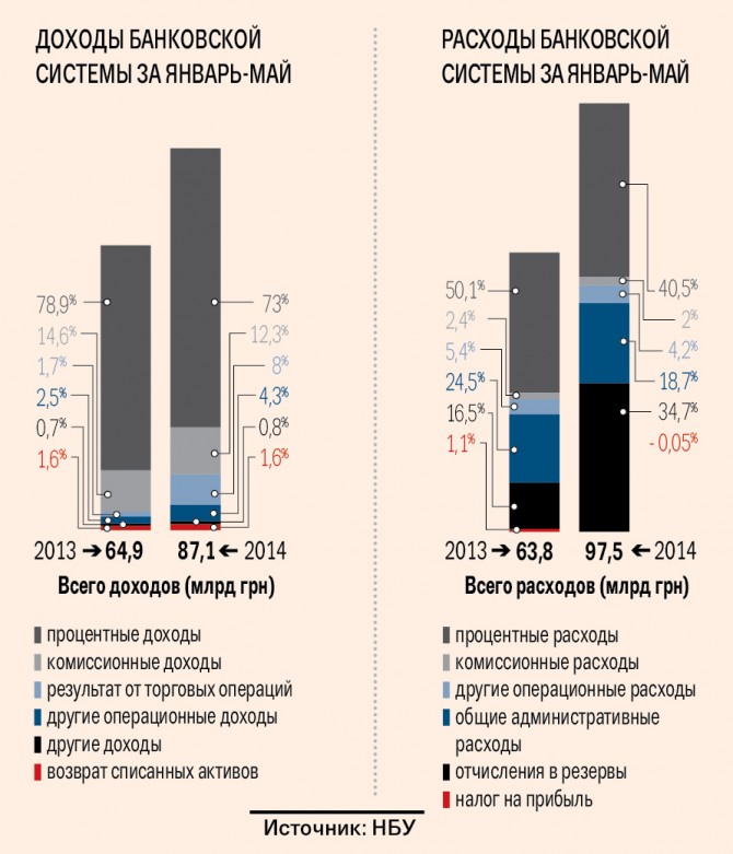 По сравнению с аналогичным периодом прошлого года как доходы, так и расходы украинских финучреждений выросли. Но издержки увеличивались более динамично: рост расходной части составил 52,8 %, тогда как доходной — всего 34,3 %. Увеличение расходов банков обусловлено прежде всего формированием резервов. В структуре расходной части доля отчислений в резервы с февраля 2014 г. стабильно держится на уровне выше 30 %. Объем отчислений в мае составил 10 млрд грн и по итогам пяти месяцев 2014 г. достиг 33,8 млрд грн. За аналогичный период прошлого года финучреждения потратили на формирование резервов в три раза меньше. Платежеспособные банки делали доотчисления в резервы по валютным кредитам в связи с ростом курса доллара, говорит председатель правления банка «Хрещатик» Дмитрий Гриджук.