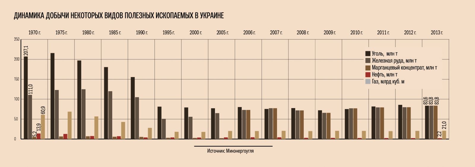 При возросшем значении для украинской экономики добывающая отрасль в целом находится в стадии глубокой стагнации. Добыча основных ископаемых по сравнению с пиковыми 1970‑ми снизилась к середине 1990‑х и остается на этом уровне. Если в 1975 г. Украина добыла 123 млн т железной руды, 215,7 млн т угля, 68,7 млрд куб. м природного газа, 12,8 млн т нефти и 6,5 млн т марганцевых руд, то в 1995 г. добыча руды и угля снизилась в 2,5 раза (до 50,7 млн т и 83,8 млн т соответственно), газа — в 3,8 раз (до 18,2 млрд куб. м), нефти — в 3 раза (до 4,1 млн т) и марганцевых руд — в 2 раза (до 3,2 млн т) — см. «Динамика добычи некоторых видов полезных ископаемых».