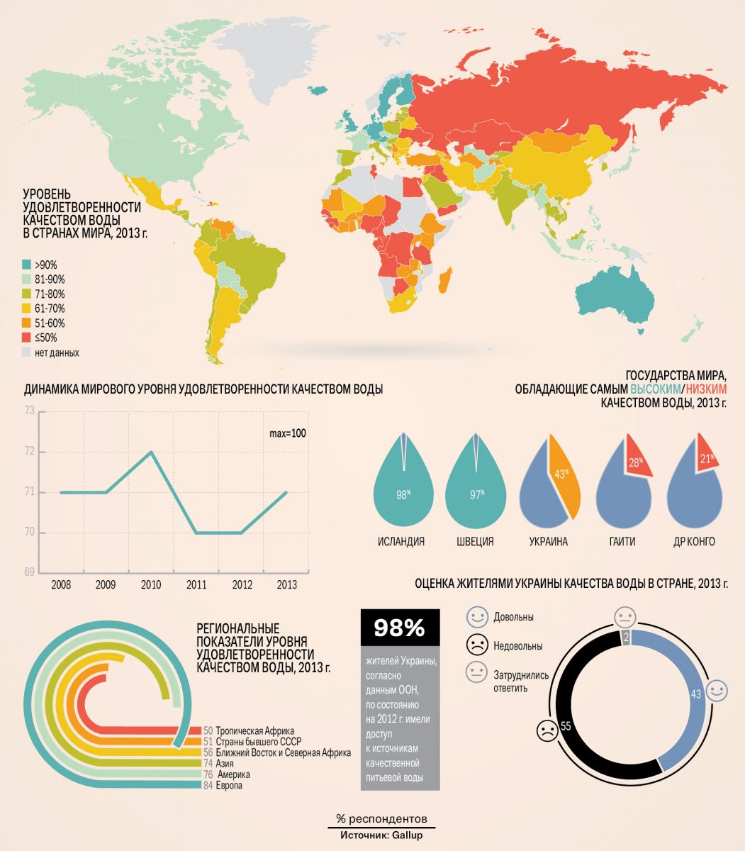 В прошлом году уровень удовлетворенности используемой водой среди украинцев составлял лишь 43 %. По этому показателю наша страна оказалась на дне мирового рейтинга — на 130‑й позиции среди 138 государств. Таковы результаты исследования общественного мнения, проведенного международной исследовательской компанией Gallup.