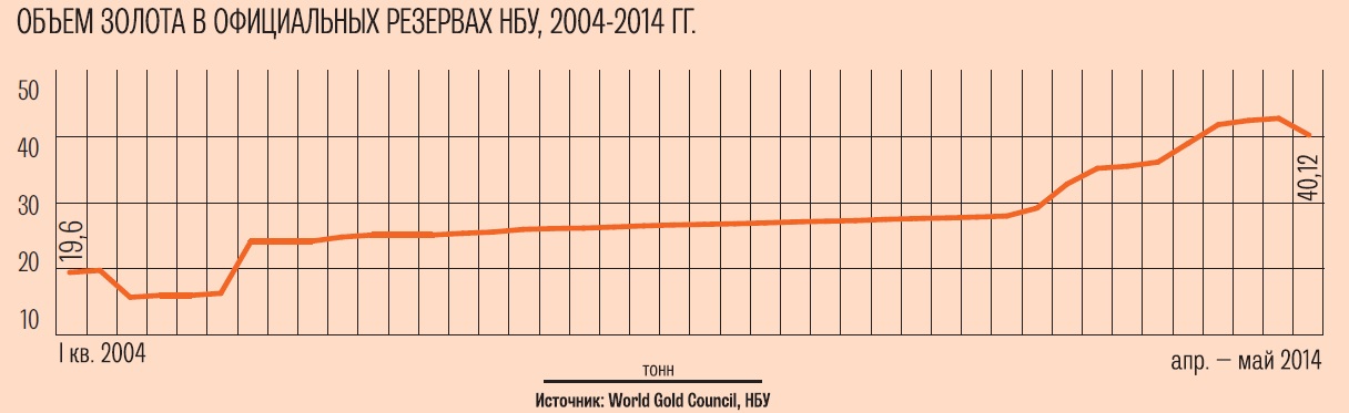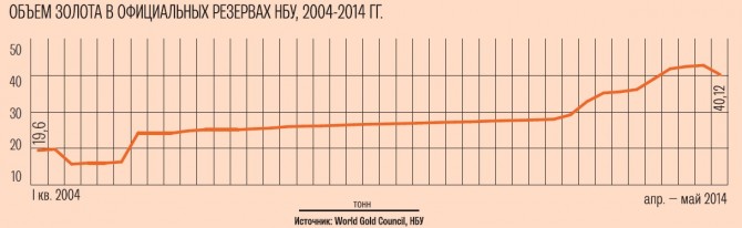 Напротив, цена на золото достигла пика 14 марта ($ 1385 за тройскую унцию), затем обвалилась и с начала апреля и почти весь май держалась на одном уровне. Лишь за последнюю неделю весны она упала на 3 % — до $ 1250,5 за тройскую унцию. В результате золотой распродажи НБУ и снижения цен на драгметалл его объем в резервах снизился за месяц в денежном выражении на $ 158,9 млн, а его доля — с 12,5 % до 9 %. Однако снижение цен было временным. Как в мае, так и в июне, объясняют эксперты международных инвестиционных компаний и банков, снижение цен на золото ограничивают геополитические риски, связанные с ситуацией в Ираке и Украине.