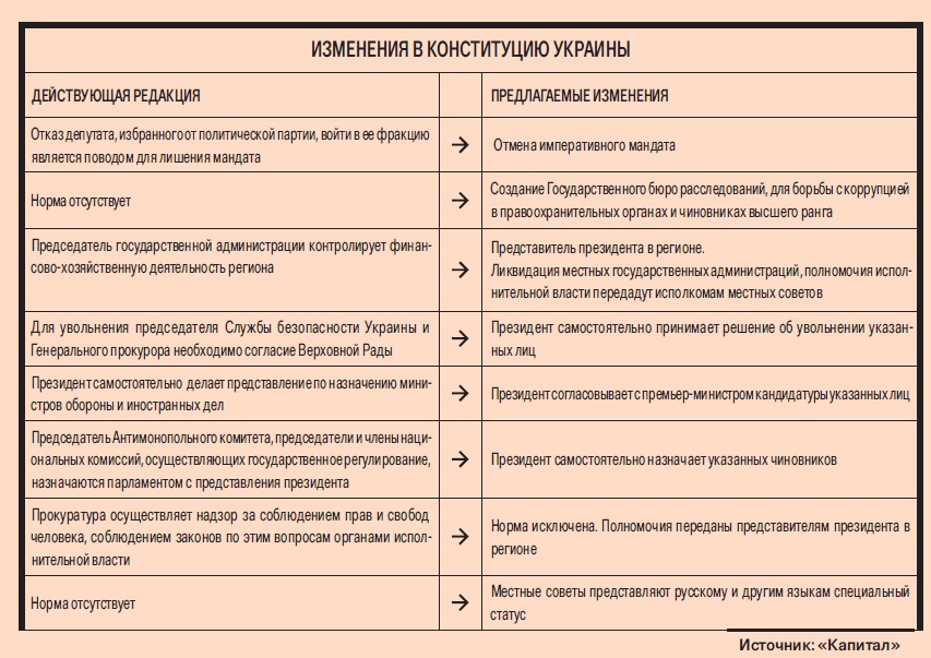 Копию законопроекта, анонсированного главой государства, «Капиталу» удалось получить в Администрации президента. Документ, который предлагает изменения в 19 статей Основного закона, имеет небольшие отличия от рабочей версии, розданной в начале прошлой недели лидерам фракций. Но основные положения остались прежними — децентрализация власти, усиление президентского влияния на силовые министерства и упрощение формирования парламентской коалиции.