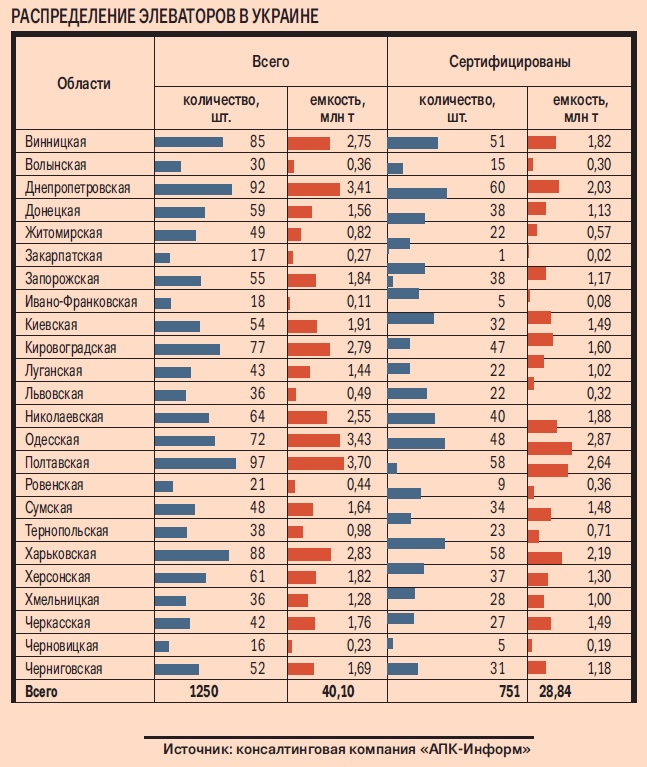 По данным руководителя бизнес-проектов компании «АПК-Информ» Родиона Рыбчинского, всего в Украине работает 700 элеваторов, из которых около 230 принадлежат трейдерским компаниям. Лидером же по владению элеваторными мощностями является государство.
