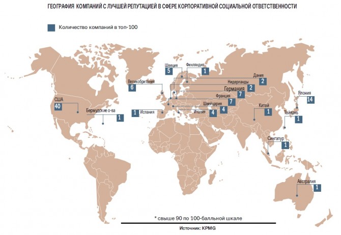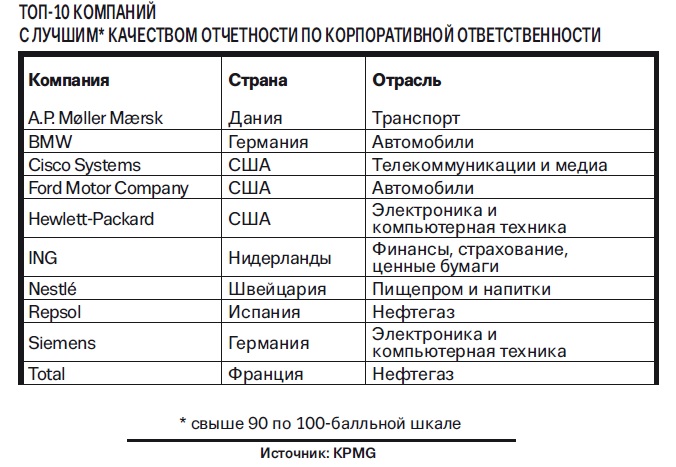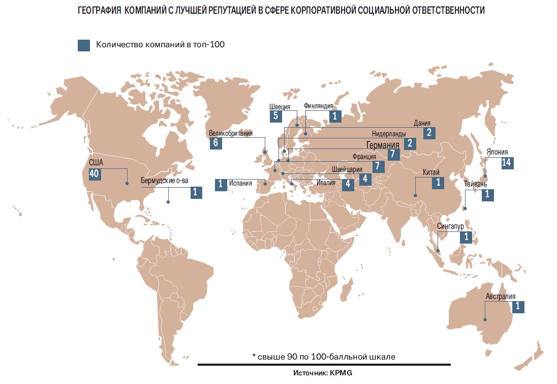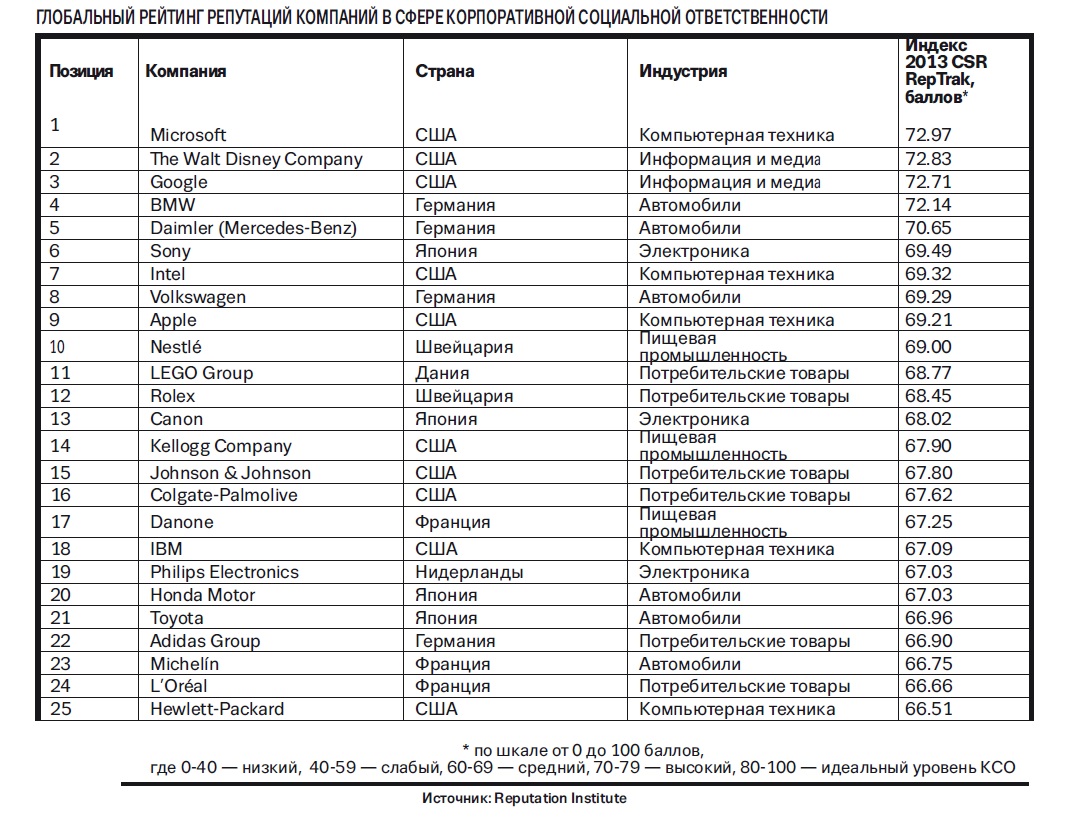 Последние два года сотню компаний с наиболее качественной КСО в мире по версии Reputation Institute возглавляют Microsoft, Walt Disney Company, Google и BMW. Если Microsoft получил «приз зрительских симпатий» по оценкам американцев, то европейскую тройку лидеров составляют как раз Walt Disney Company, Google и BMW. Причем каждая из этих компаний лучшая в какой‑то отдельной категории.