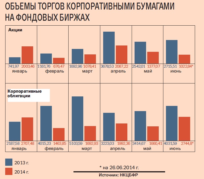 Снизились в первом полугодии и торги акциями. Объем организованных торгов акциями в январе-июне составил лишь 8,2 млрд грн против 12,5 млрд грн за аналогичный период 2013 г., следует из данных НКЦБФР. Исторически наиболее привлекательные эмитенты акций расположены именно в нестабильной сейчас юго-восточной и центральной части страны, говорит генеральный директор компании по управлению активами «ТАСК-Инвест» Татьяна Жолнарская. Это, по ее словам, удерживает инвесторов от активных вложений, в частности в акции Енакиевского меткомбината или Ясиновского коксохима. С акциями Енакиевского метзавода за 6 месяцев 2014 г. было совершено сделок всего на 58,2 млн грн, в то время как за аналогичный период 2013 г. эта сумма составила 118,9 млн грн.