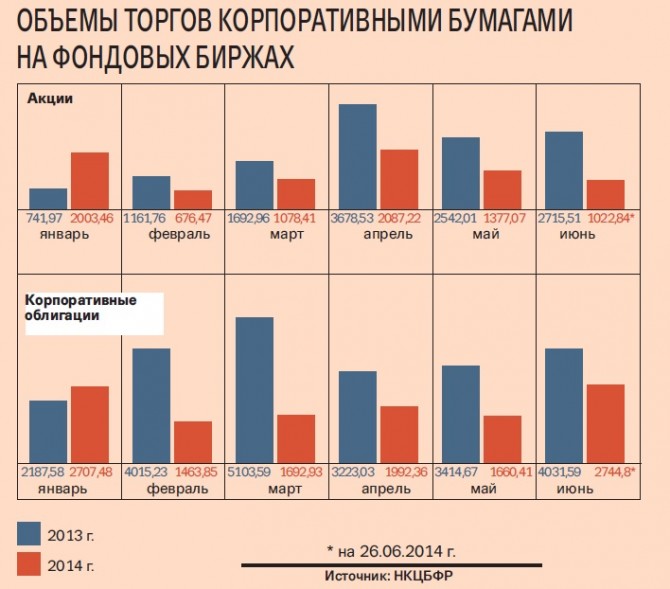 Объем торгов корпоративными облигациями в первом полугодии снизился почти в два раза, до 12,3 млрд грн, следует из данных Национальной комиссии по ценным бумагам и фондовому рынку (НКЦБФР). В первой половине 2013‑го на биржах наторговали облигациями предприятий на 21,9 млрд грн.