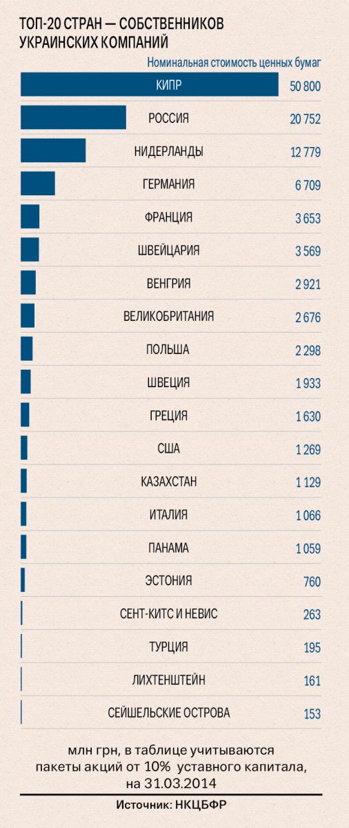 Национальная комиссия по ценным бумагам и фондовому рынку подсчитала номинальную стоимость украинских именных ценных бумаг, находящихся в собственности нерезидентов (10 % акций эмитента и больше) в І квартале 2014 г. Суммарно нерезиденты из 51 страны мира вложили в акции украинских предприятий около 117 млрд грн.