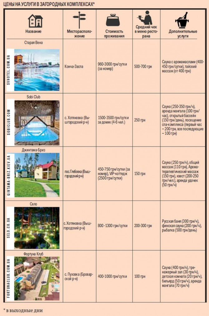 Под Киевом работают около 15 загородных комплексов. «В среднем каждый из них рассчитан на 80 номеров», — отмечает Олег Болотов. Этого недостаточно, чтобы обеспечить растущий спрос на отдых на природе. Благодаря этому гостиницы могут удерживать цены, подчеркивает Владимир Царук. Например, по его данным, средняя стоимость составляет 540‑700 грн за стандартный номер в сутки. Арендовать двухэтажный дом с двумя спальнями на выходные можно за 1,5 тыс. грн за ночь. Цены, скорее всего, снижаться не будут, прогнозирует Александр Коптев. О таком собственники киевских отелей могут только мечтать.