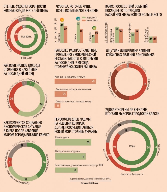 Таковы итоги второй волны исследования общественного мнения жителей Киева, проведенного с 21 июня по 1 июля 2014 г. исследовательской компанией Research & Branding Group (R&B Group). Информацией для анализа послужили итоги опроса более 800 совершеннолетних граждан, имеющих киевскую прописку.