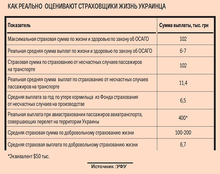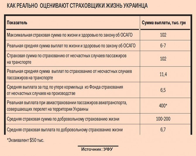 Стоимость жизни украинцев более-менее адекватно оценена только в вопросах, которые касаются транспорта. Оценка определена в законе Украины «Об обязательном страховании гражданско-правовой ответственности владельцев наземных транспортных средств» (об ОСАГО), постановлении Кабмина №959 «Об обязательном личном страховании от несчастных случаев на транспорте», в Воздушном кодексе Украины. Согласно этим документам, жизнь украинца оценивается невысоко.