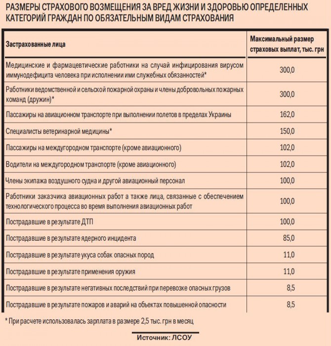 По закону в случае смерти военнослужащего единоразовое пособие назначается и выплачивается в размере 500‑кратного прожиточного минимума. Это сегодня составляет чуть более 600 тыс. грн. Гораздо меньше выплатят родственникам погибших из‑за неумышленных действий владельцев оружия — всего 11 тыс. грн. Если же человек умирает при перевозке опасных грузов или в результате пожаров и аварий на объектах повышенной опасности, то его жизнь оценивается в нашей стране в сумме не более 8,5 тыс. грн. «Суммы денежных возмещений при гибели в нашей стране колеблются в пределах 8,5‑300 тыс. грн.» — подсчитал Александр Залетов.