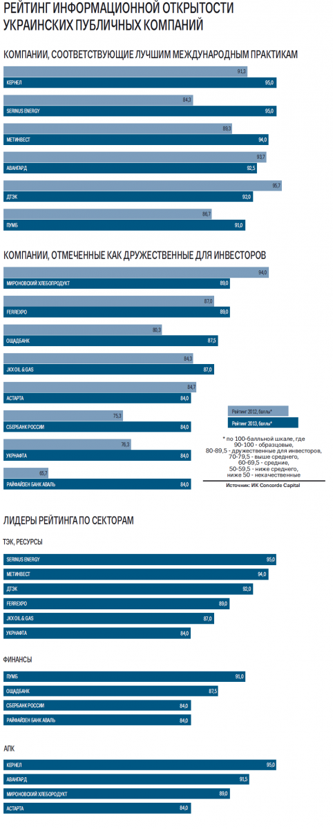 Необходимость меняться для привлечения зарубежного капитала также движет украинскими олигархами. Так, в 2007 г. именно контролируемые бизнес-группами компании показали самый удручающий результат, который оказался хуже, чем для традиционно неэффективных госкомпаний. В те времена олигархи мало задумывались о привлечении капитала извне, предпочитая финансировать свои компании за счет перераспределения прибыли от других своих бизнесов. Но после кризиса 2008‑2009 гг. ситуация несколько изменилась. У бизнес-групп начала появляться более осознанная структура и отдельные компании, созданные для привлечения капитала за рубежом. Такие компании-флагманы создавались с применением лучших практик корпоративного управления. Так, в последние годы отдельные компании олигархов закрепились на самых высоких позициях. К примеру, в 2013 г. металлургический холдинг «Метинвест» и энергетический холдинг ДТЭК Рината Ахметова получили высшую оценку качества корпуправления («Q» в тематическом рейтинге ИК Concorde Capital, что соответствует пятерке по 5‑балльной шкале) среди украинских компаний-эмитентов облигаций. Правда, большинство олигархических активов, ранее не блиставших высокими стандартами и полагающихся на привлечение денег флагманами, так и остались на задворках последних рейтингов. Так, входящий в «Метинвест» меткомбинат Азовсталь получил оценку «АА» (четверка по 5‑балльной шкале), Харцызский трубный завод, Енакиевский метзавод, Авдеевский коксохимический завод и ММК им. Ильича, а также Центральный и Северный ГОК — «А» (тройка). Аналогичная ситуация и с активами ДТЭК. Входящее в энергетическое подразделение SCM Киевэнерго имеет рейтинг «А» (тройка), Днепрооблэнерго, Днепрэнерго, Крымэнерго и Захидэнерго — «ВА» (двойка).