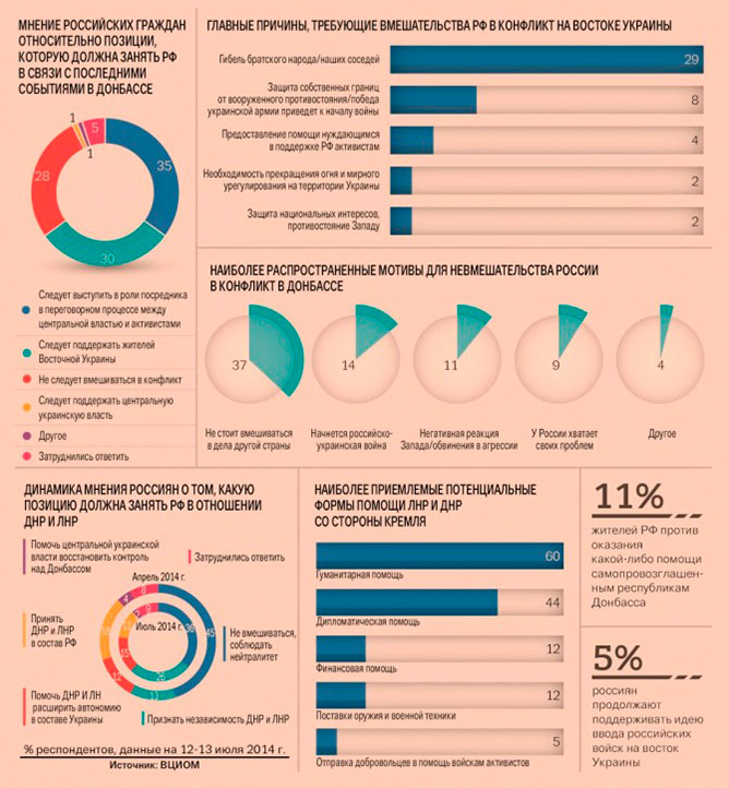 Более трети (35 %) населения Российской Федерации считают, что Кремль должен стать посредником в урегулировании конфликта на востоке нашей страны и организовать диалог между центральной властью и лидерами самопровозглашенных республик. В то же время трое из десяти российских граждан настаивают на оказании всесторонней поддержки донбасским активистам, а 28 % россиян уверены в нецелесообразности вмешательства Москвы в противостояние на востоке Украины. И лишь один из ста жителей РФ советует своему правительству поддержать действия центральной украинской власти.