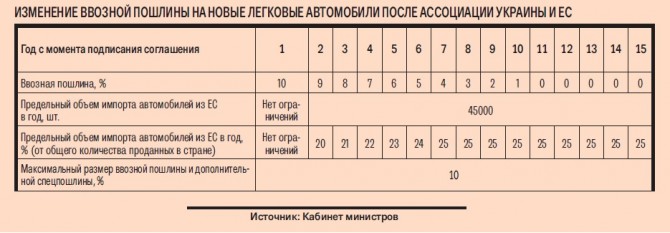 Украина может сохранить заградительные пошлины на иномарки. Это следует из текста Соглашения об ассоциации с Евросюзом. Документ устанавливает поэтапное снижение ввозной пошлины на новые легковые автомобили, выпущенные в странах Евросоюза. В первый год после подписания соглашения пошлина останется на ныне действующей отметке — 10 % таможенной стоимости, — а в последующие девять лет будет снижаться на 1 процентный пункт каждый год: до 9 % в 2015 г., до 8 % в 2016 г. и так далее. Таким образом, пошлина станет нулевой в 2025 г., на одиннадцатый год с момент подписания соглашения.