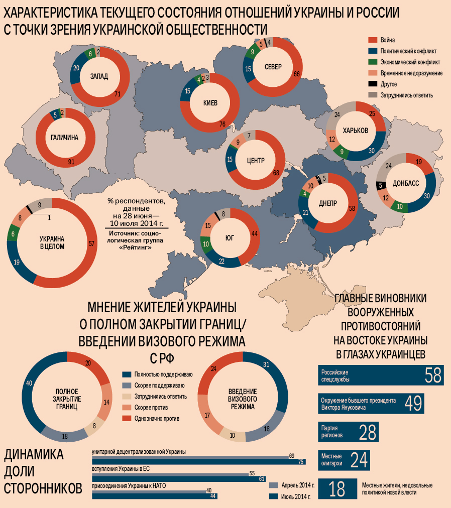В связи с этим более половины (58 %) украинцев поддерживают идею полного закрытия границы с Россией, тогда как противниками такого решения оказалась треть (34 %) респондентов. Позиция украинского населения по возможному введению визового режима со страной-агрессором выглядит менее однозначной: сторонниками такого решения оказалась половина (49 %) населения Украины, а противниками — четверо из десяти (41 %) жителей. Помимо этого, главными виновниками вооруженного конфликта в Донбассе украинцы по‑прежнему считают российские спецслужбы: сторонниками такого мнения в июле 2014 г. оказались 58 % респондентов. Все сильнее становится уверенность украинской общественности в том, что ответственность за разжигание общественного противостояния на востоке Украины лежит и на ближайшем окружении бывшего президента Виктора Януковича (42 % в апреле против 49 % в июле). В то же время сократилась доля украинцев, верящих, что движущей силой донбасского конфликта являются местные жители, недовольные политикой новой власти (22 % против 18 %).