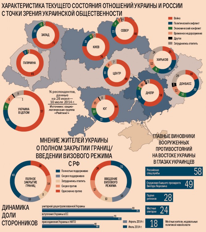 Более половины (57 %) населения нашей страны характеризуют сегодняшние отношения между Украиной и Российской Федерацией как войну. Один из пяти (19 %) украинцев считает, что соседние страны находятся в состоянии политического конфликта, а 8 % наших соотечественников называют сложившуюся в двусторонних отношениях ситуацию временным недоразумением. Таковы результаты исследования общественного мнения жителей Украины, проведенного с 28 июня по 10 июля 2014 г. социологической группой «Рейтинг». Информацией для анализа послужили итоги опроса 4 тыс. совершеннолетних жителей, представляющих все регионы нашей страны, за исключением оккупированной АР Крым.