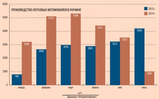 По данным «Укравтопрома», в июне в нашей стране всего было произведено 1009 легковых автомобилей, что в 3,5 раза меньше, чем в мае этого же года. А относительно июня прошлого года производство снизилось еще существеннее — в 4 раза. Впрочем, по итогам шести месяцев результаты деятельности автопроизводителей еще пока лучше, чем за соответствующий период 2013 г., — в текущем полугодии объемы выпуска составили 22 561 автомобиль и превышают прошлогодний показатель на треть.