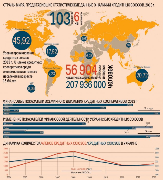 Несмотря на рост доли участвующих в кредитных союзах взрослых украинцев (3,48 % в 2012 г. против 4,07 % в 2013 г.), уровень проникновения кооперативного кредитования в Украине вдвое ниже мирового, но немного выше среднеевропейского показателя (3,93 %). В 2013 г. украинским кредитным союзам удалось практически вдвое увеличить размер своих резервов, а также немного нарастить объем сбережений. Однако по сравнению с 2012 г. они сократили совокупную сумму выданных кредитов.