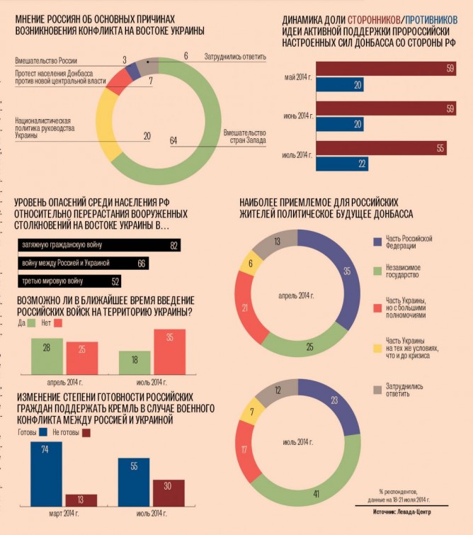 Несмотря на страх быть вовлеченными в вооруженное противостояние, более половины (55 %) граждан РФ по‑прежнему готовы поддержать собственное правительство при объявлении войны Украине. В то же время с марта 2014 г. более чем вдвое выросла (13 % против 30 %) доля россиян, не желающих оправдывать действия Кремля в случае вооруженного конфликта с соседями.