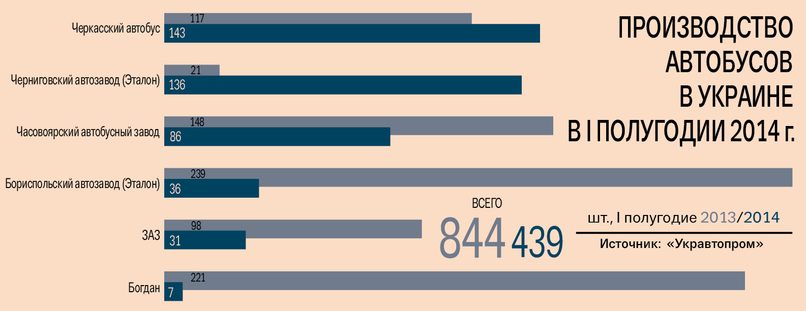 Производство автобусов в Украине — единственная подотрасль автомобилестроения, которая по итогам первого полугодия 2014 г. показала снижение. Даже выпуск легковых автомобилей, резко упавший в ІІ квартале, за январь-июнь продемонстрировал позитивную динамику по сравнению с аналогичным периодом прошлого года. Выросло и производство грузовиков, зато выпуск автобусов сократился на целых 48 % по сравнению с первым полугодием 2013 г.