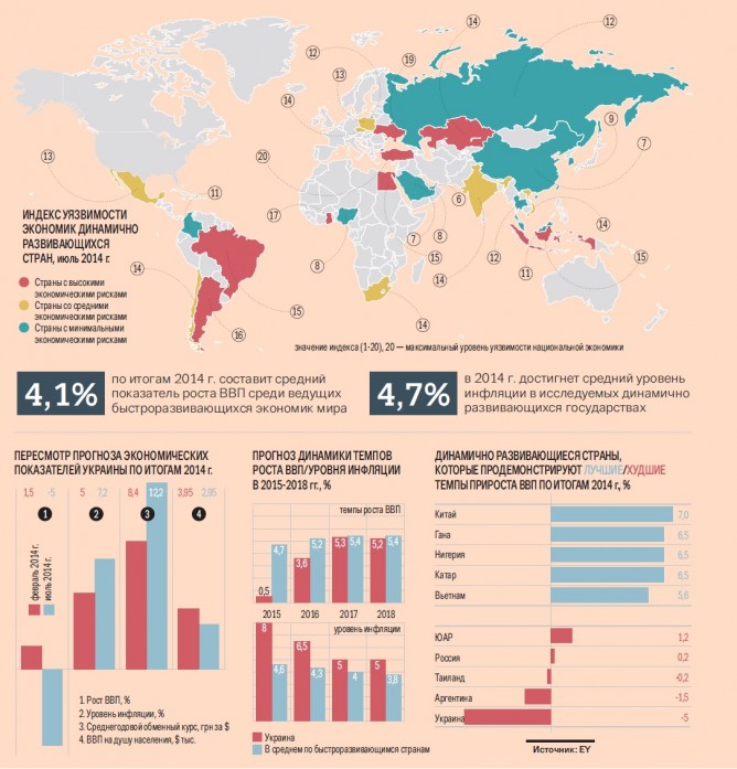 По итогам 2014 г. Украина окажется в списке трех динамично развивающихся государств (вместе с Аргентиной и Таиландом), которые продемонстрируют отрицательный прирост валового внутреннего продукта (ВВП). Согласно предварительным оценкам, в текущем году реальный ВВП нашей страны сократится на 5 %. Таковы данные ежеквартального отчета «Прогноз для быстроразвивающихся экономик мира», подготовленного транснациональной аудиторской компанией EY совместно с глобальным исследовательским центром Oxford Economics.