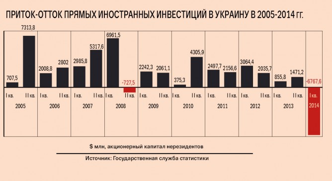 За первое полугодие Украина лишилась 90 % прямых иностранных инвестиций, которые поступили в страну за предыдущие два года. На начало июля, сообщает Государственная служба статистики, объем вложений акционерного капитала в украинскую экономику, накопленный с момента начала инвестирования, составил $ 50 млрд. В то же время в первый день года эта сумма составляла $ 56,8 млрд. За шесть месяцев экономика, прошедшая через революцию, аннексию Крыма и военный конфликт на востоке, потеряла $ 6,8 млрд., или 12 % накопленных капиталовложений от прямых инвесторов из‑за рубежа. Для сравнения — за 2012‑2013 гг. ей удалось привлечь лишь $ 7,4 млрд. С такими потерями ПИИ Украина не сталкивалась даже в годы глобального финансового кризиса, когда в мире происходили массовый уход инвесторов из развивающихся экономик и репатриация капитала, а в нашей стране была рецессия и глубокая девальвация гривни.