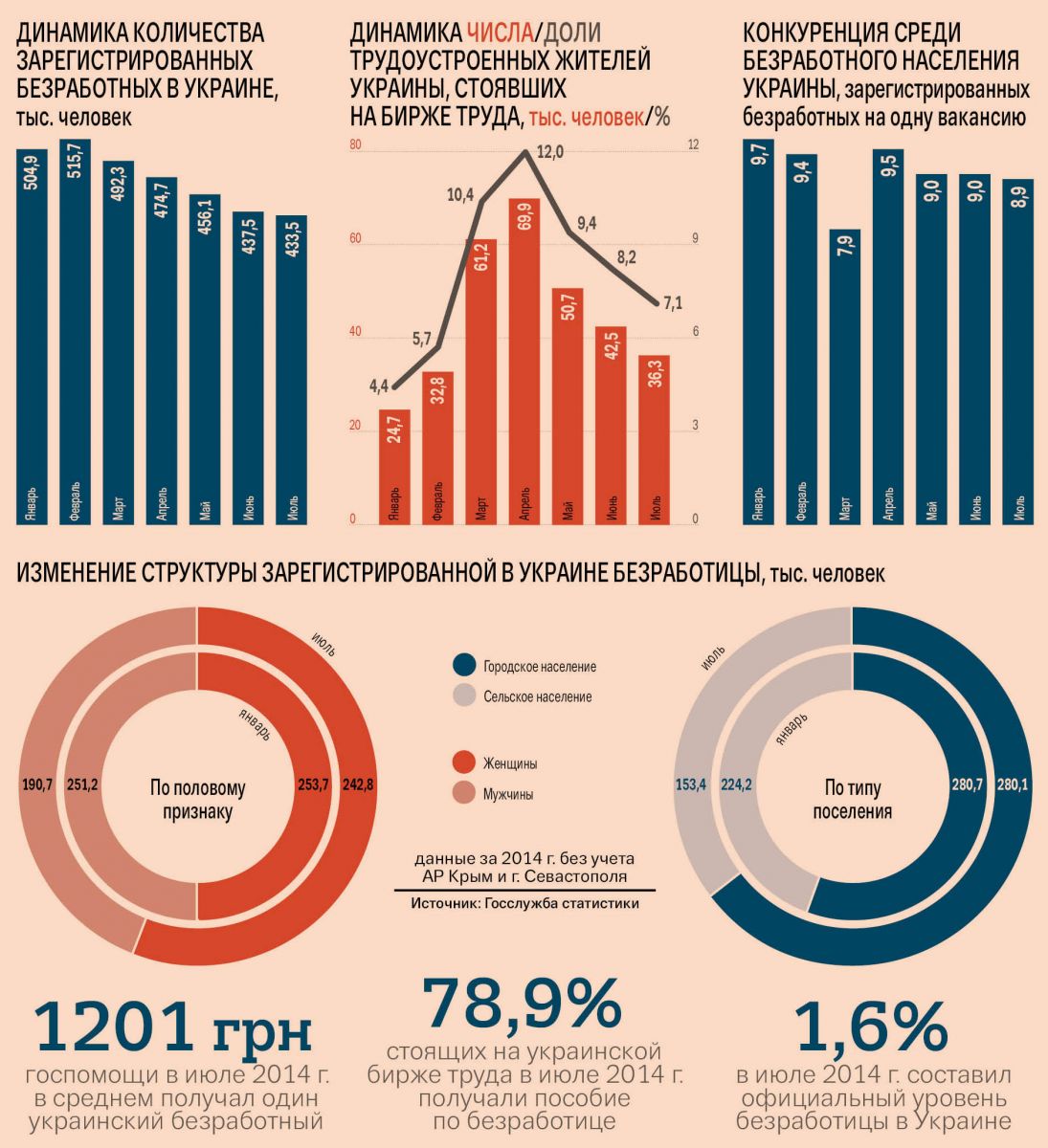 По итогам июля 2014 г. количество украинцев, стоящих на бирже труда, сократилось на 4 тыс. — до 433,5 тыс. человек, что стало лучшим показателем в текущем году. Таким образом, официальный уровень безработицы в нашей стране снизился до отметки в 1,6 %. Об этом свидетельствуют данные, обнародованные вчера Государственной службой статистики. При статистических расчетах не учитывались показатели Крымского полуострова.