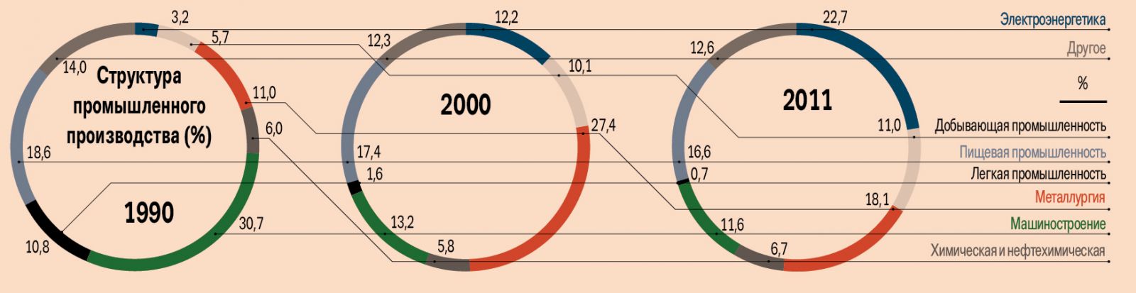 Начиная с 1990 г. на протяжении всех 1990‑х падение промпроизводства варьировалось, а в 1994 г. достигло спада в 28,2 %. И только по итогам 2006 г. Украина смогла на 0,8 % превзойти промышленные показатели 1990 г. Сейчас ситуация снова создает повод для беспокойства. Из-за военной операции в Донбассе, где сконцентрирована львиная доля предприятий страны, промышленность переживает спад, подобный тому, что был в разгар кризиса 2008‑2010 гг. Согласно последним данным Государственной службы статистики, в июле падение промпроизводства ускорилось до 12,1 % к предыдущему месяцу. А по итогам семи месяцев текущего года относительно аналогичного периода 2013 г. спад составил 5,8 %. В региональном разрезе сокращение производства в Донецкой и Луганской областях по сравнению с июнем показало невообразимые 28,5 % и 56,0 % соответственно.